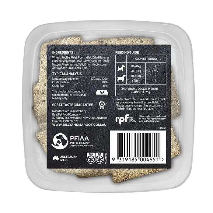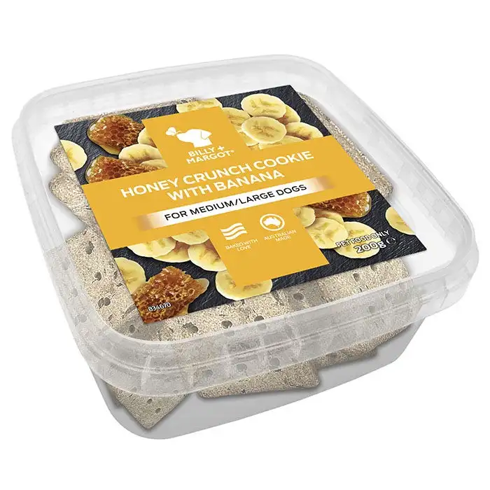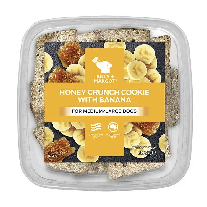 Indulge your beloved dog with Billy + Margot cookies, a premium range of delicious oven baked delights. Lovingly crafted with quality ingredients, fruity burst of banana and all the goodness of honey, these nutritious cookies are a real treat your dog will love.