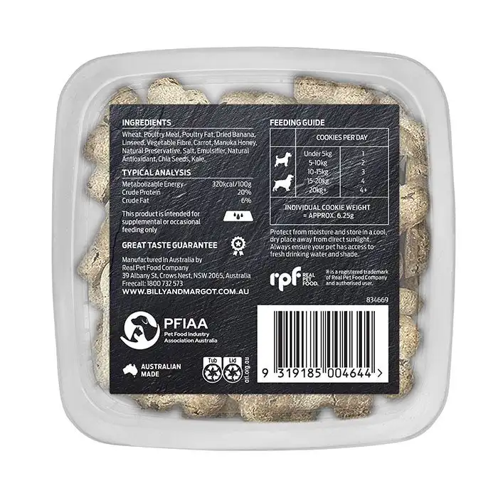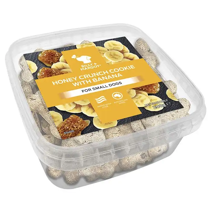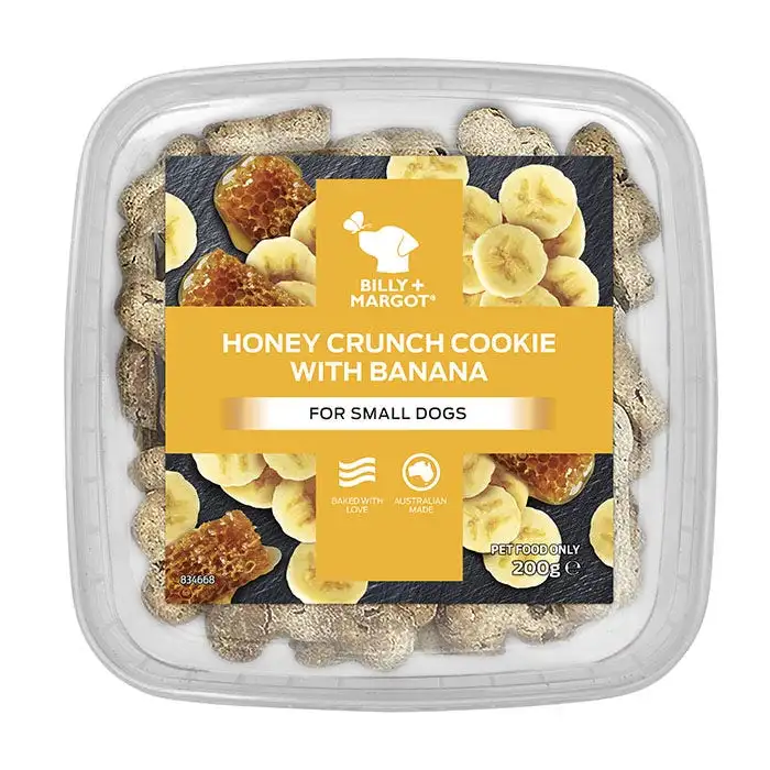 Indulge your beloved dog with Billy + Margot cookies, a premium range of delicious oven baked delights. Lovingly crafted with quality ingredients, fruity burst of banana and all the goodness of honey, these nutritious cookies are a real treat your dog will love.