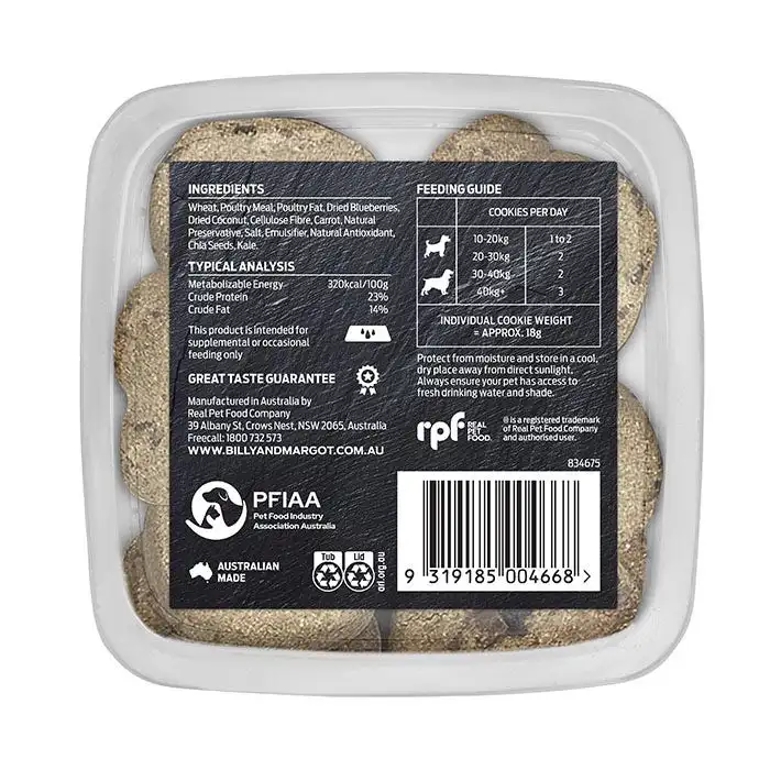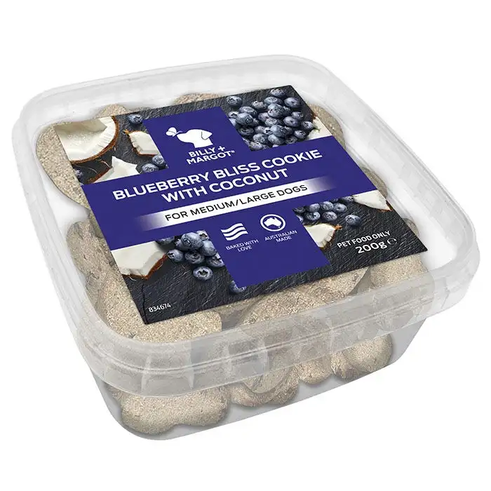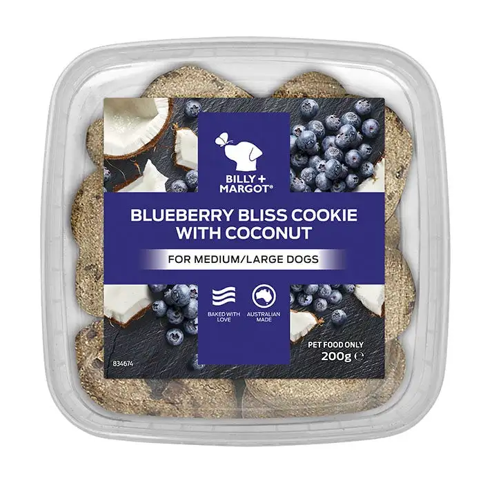 Indulge your beloved dog with Billy + Margot cookies, a premium range of delicious oven baked delights. Lovingly crafted with quality ingredients, fruity burst of blueberries and coconut, these nutritious cookies are a real treat your dog will love.