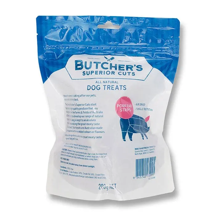 Butcher’s Superior Cuts Pork Ear Strips are made with 100% air dried pork, natural goodness with the great meaty taste your dog will love.