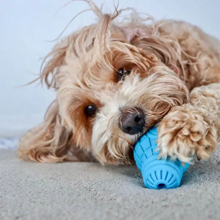 Deep, textured grooves line the outside of the toy, which helps to clean and strengthen teeth for improved dental health. These grooves are also perfect to allow your dogs favourite smear treat, like peanut butter or yoghurt, to cover the outside, adding a new dimension to play time. A unique bulb shape, which is easier to pick up, grip, bite and clean teeth.