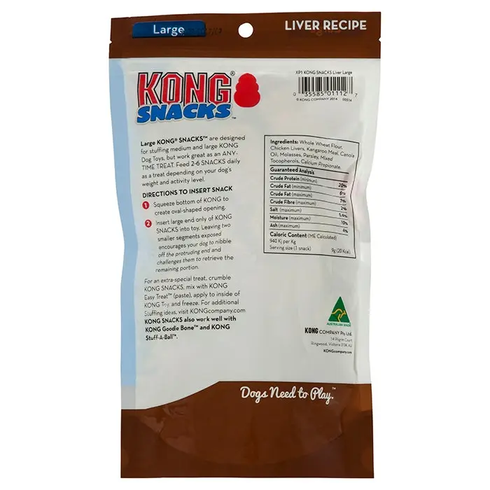 Your dogs will lap up these delicious liver flavoured treats from Kong Snacks. Suitable for use with larger Kong slow feeders, these tasty treats keep your dog occupied, encouraging active play and a healthy lifestyle. Feed your pets 2-6 treats daily, depending on their weight and activity level.