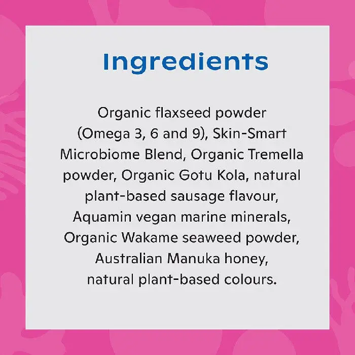 Nectar Skin + Coat contains organic flaxseed, a rich source of plant-based omega 3, 6 and 9 essential fatty acids, an innovative Skin-Smart microbiome blend of specially selected probiotics and postbiotics and skin hydrating ingredients, along with Gotu Kola and biotin to boost the formation of collagen and skin tissue and to give your dog healthy skin and a shiny coat.