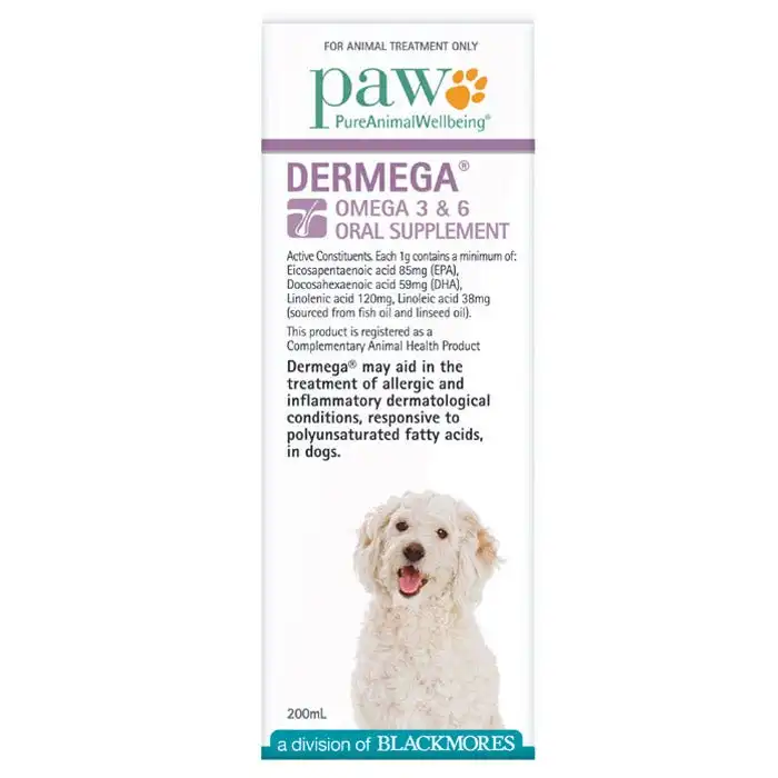 As an aid to common symptoms of allergic skin conditions that can cause them significant pain, PAW Dermega Skin support promotes healthy skin in dogs with dry itchy skin, and flea allergies. This product includes omega 3 and 6 essential fatty acids to improve your pets coat shine and lustre. It comes with a non-drip, measured, no-mess pump to allow for easy dosing.