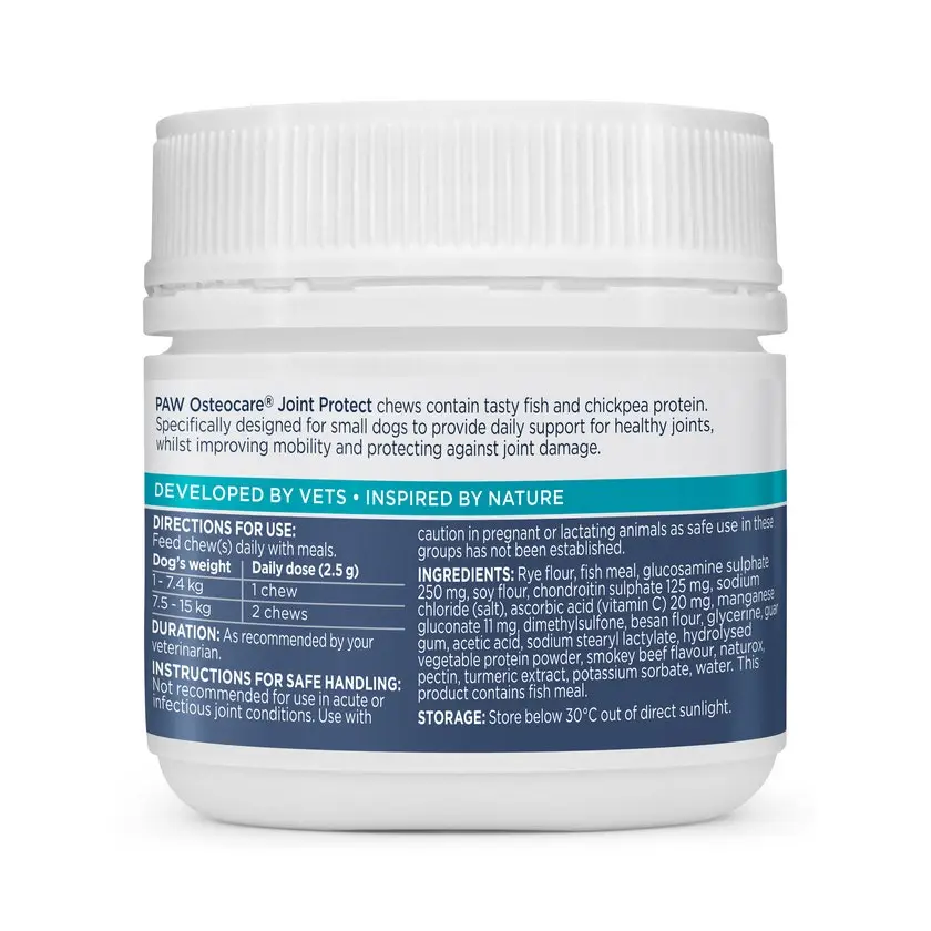 | Feeding Guide | PAW Osteocare Chews are available in a 75 g tub. Each tub contains approximately 30 chews. To provide daily support for healthy joints, feed as follows: Dosage: 1-7.4kg Dog: 1 Chew, 7.5-15kg Dog: 2 Chews |