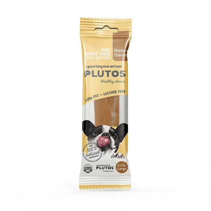 PLUTOS Cheese & Chicken Chew 100% NATURAL are produced with high quality milk protein rich in essential amino acids and high quality proteins. Our chews are lactose and gluten free with irresistible flavours. They do not splint allowing dogs to chew and enjoy until the end. PLUTOS contain casein milk protein, which has an antibacterial effect that neutralizes bacteria in teeth, it prevents the formation of plaque and eliminates bad breath. PLUTOS Chews digestibility is graded as EXCELLENT. Probably the Healthier chew in the market.