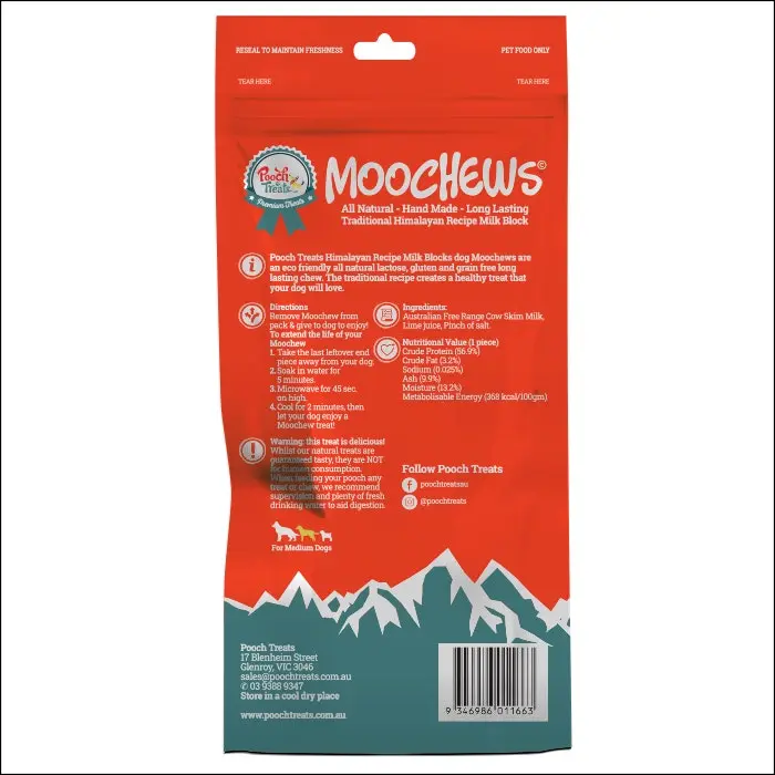 Pooch Treats Moo Chews are a delicious Lactose free hard cheesy Milk block made using all Australian Free Range Cow Milk from a traditional Himalayan Recipe. They are eco friendly,Lactose,Grain and gluten free. A great long lasting occupier that will help maintain your doggos teeth.