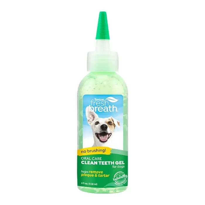 • Simply apply two drops of TropiClean Fresh Breath Clean Teeth Oral Care Gel to each side of your dog’s mouth daily to help remove plaque & tartar.