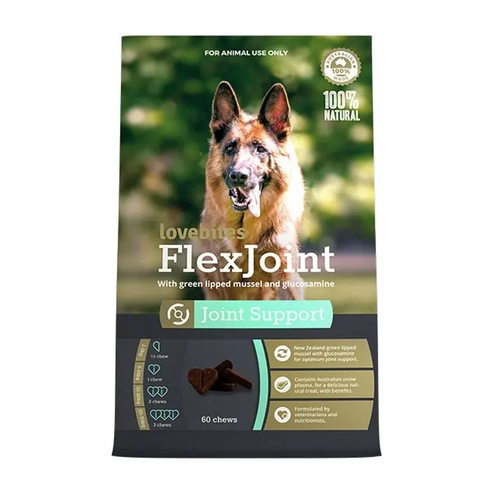 | Feeding Guide | Present to your dog as a tasty treat directly from the hand. Provide 1 chew per 10kg of bodyweight, daily. It is recommended dogs receive FlexJoint on an ongoing basis for best results. [1-5kg = half a chew, 5-10kg = 1 chew, 10-20kg = 2 chews, 20-30kg = 3 chews]. Note: Dogs of a breed with predisposed joint problems may be provided with the maintenance dose from any age. Dogs with severe osteoarthritic symptoms may receive above starting dose as ongoing therapy. |
