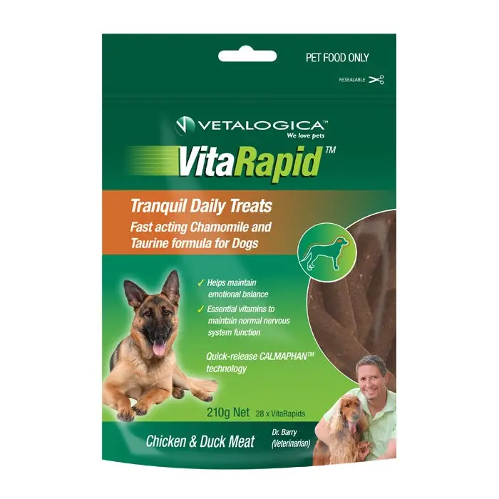 Carefully researched and developed to provide quick acting and essential vitamins and minerals for your dog. Featuring quick-release Calmaphan technology formulated with natural ingredients in a unique proprietary blend of chamomile and essential vitamins in precise ratios to provide maintenance of emotional balance and normal nervous system function. In form of convenient, delicious treat make dosing even easier with the added benefit of being fast acting. Consult your veterinarian regularly for further information and advice.